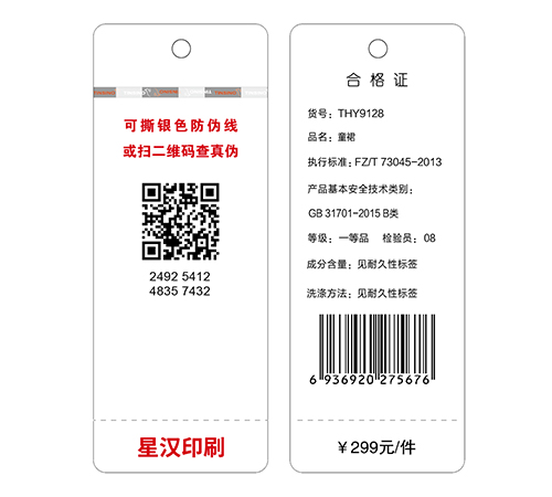 雙線安全線防偽是當(dāng)前最新防偽技術(shù)之一,其安全級別等同與人民幣防偽安全線級別。最大的特點就是安全級別高,防偽效果好,還有就是易于鑒別。其實這一點很重要,因為防偽主要是做給消費者看的,是企業(yè)提供給消費者區(qū)分真假的認(rèn)知工具,目的是讓消費者不受假冒偽劣產(chǎn)品的蒙蔽。要提高消費者鑒別積極性,提高鑒別率,使主動識別、拒絕、打擊假冒成為可能,那防偽特征就必須能夠讓任何層次的消費者、管理者無需借助任何儀器、工具或支付額外費用都能親自簡單、準(zhǔn)確地識別、而且結(jié)論準(zhǔn)確可靠。因此,安全線防偽技術(shù)是當(dāng)前最好的防偽措施之一。北京星漢特種印刷有限公司將這項技術(shù)運用到了收拾吊牌、衣服吊牌中,也受到了客戶的青睞。